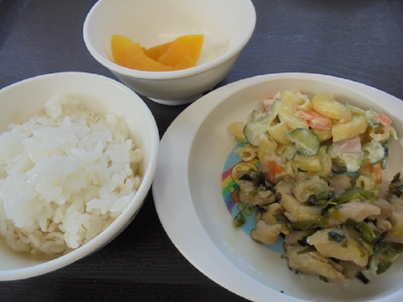 鶏肉の甘辛炒め マカロニサラダ もも缶 です