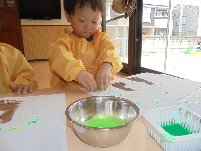溝辺園日記2018.04.05 4月の製作☆彡溝辺園 新しい保育室にも少しづつ慣れ、 お姉さん、お兄さんになったもみじ組さん✨ 今日は4月の製作をしました! 足形👣をとり、木の幹に見立てて 葉っぱは指スタンプで表現しました(*^▽^*) 2色の色を使い分け、ダイナミックに表現!!! 上手にできたね!と子どもたちも 納得のいく出来になったようです♡♡