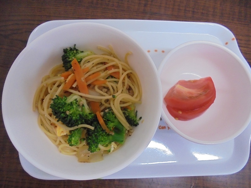 今日の献立は ブロッコリースパゲティー トマト です