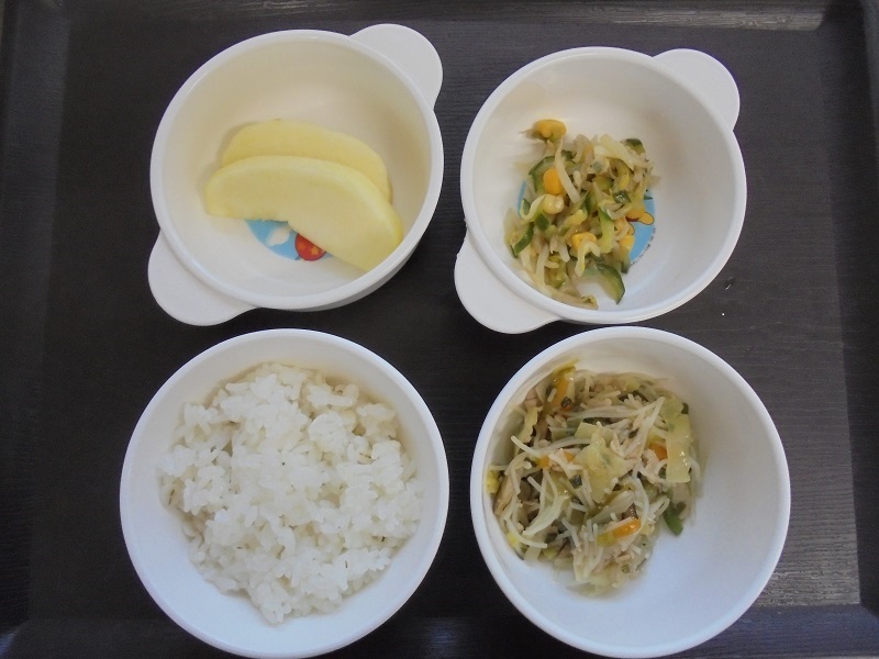 ご飯 華風炒め もやしと胡瓜の酢の物 りんご です